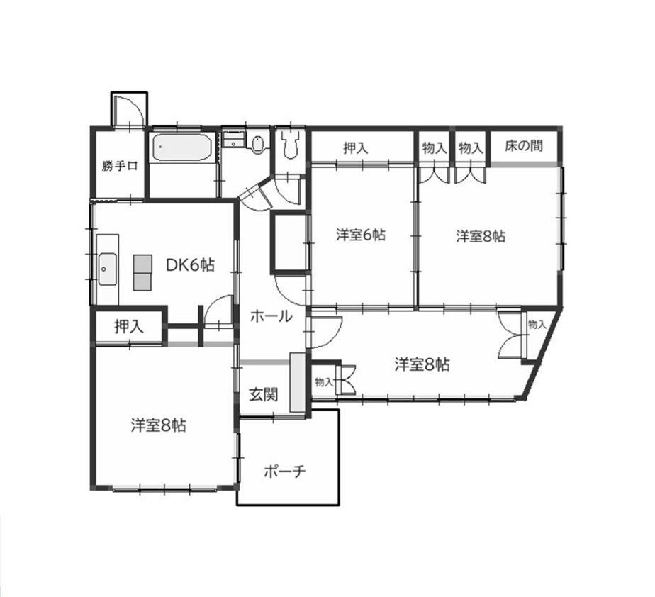 洋室8畳 3室 洋室6畳 1室 DK6畳 |